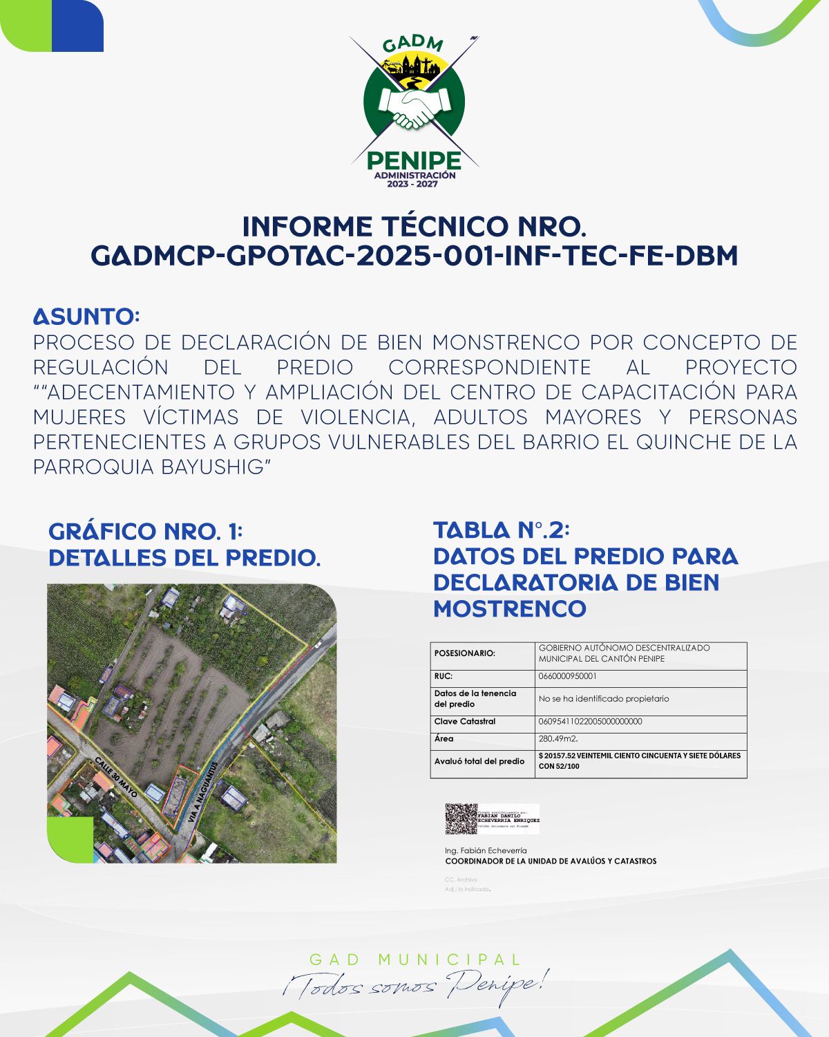SECRETARÍA GENERAL – CONCEJO MUNICIPAL DEL GOBIERNO AUTÓNOMO DESCENTRALIZADO MUNICIPAL DEL CANTÓN PENIPE.- Razón. Se notifica con la autorización de inicio del proceso de declaratoria de bien mostrenco de la propiedad urbana ubicada en la parroquia Bayushig, en relación al Art 8. Del proceso de la ORDENANZA N°004-2022-CM en posesión del GOBIERNO AUTÓNOMO DESCENTRALIZADO MUNICIPAL DEL CANTÓN PENIPE. Informesuscrito por Arq. Evelyn Guamán, COORDINADORA DE LA UNIDAD DE AVALUOS Y CATASTROS DEL GADMCP.