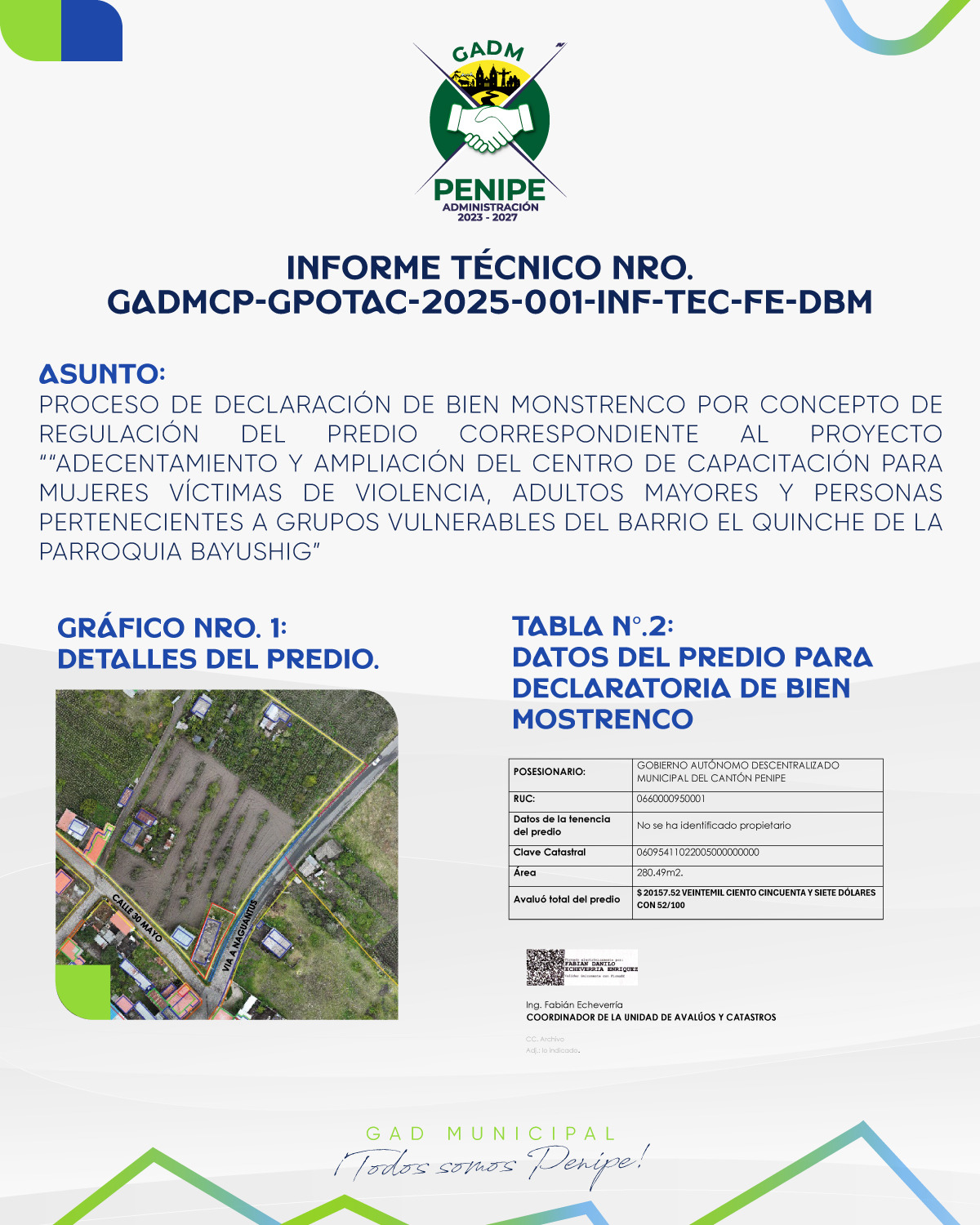 SECRETARÍA GENERAL – CONCEJO MUNICIPAL DEL GOBIERNO AUTÓNOMO DESCENTRALIZADO MUNICIPAL DEL CANTÓN PENIPE.- Razón. Se notifica con la autorización de inicio del proceso de declaratoria de bien mostrenco de la propiedad urbana ubicada en la parroquia Bayushig, en relación al Art 8. Del proceso de la ORDENANZA N°004-2022-CM en posesión del GOBIERNO AUTÓNOMO DESCENTRALIZADO MUNICIPAL DEL CANTÓN PENIPE. Informe suscrito por Arq. Evelyn Guamán, COORDINADORA DE LA UNIDAD DE AVALUOS Y CATASTROS DEL GADMCP.